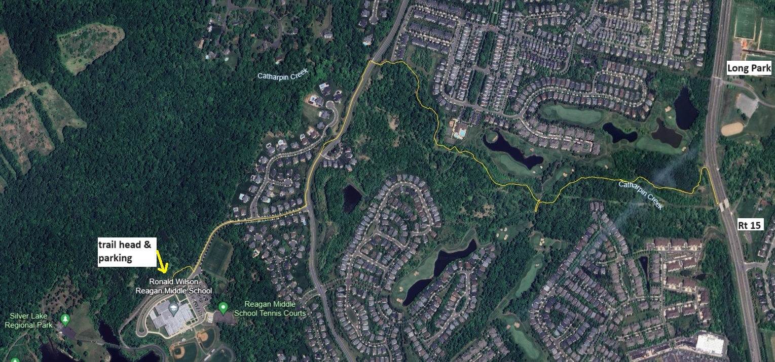 Join us for the hike on Sunday, June 9, 2024. We will hike the route between Silver Lake Park and Rt 15, and a planned connection to James Long Park. We’ll follow the existing Catharpin Creek Trail most of the way, but will walk on a shared-use path along the street to bypass a wet and muddy trail section. Total length of the hike is about 4 miles. Please register here