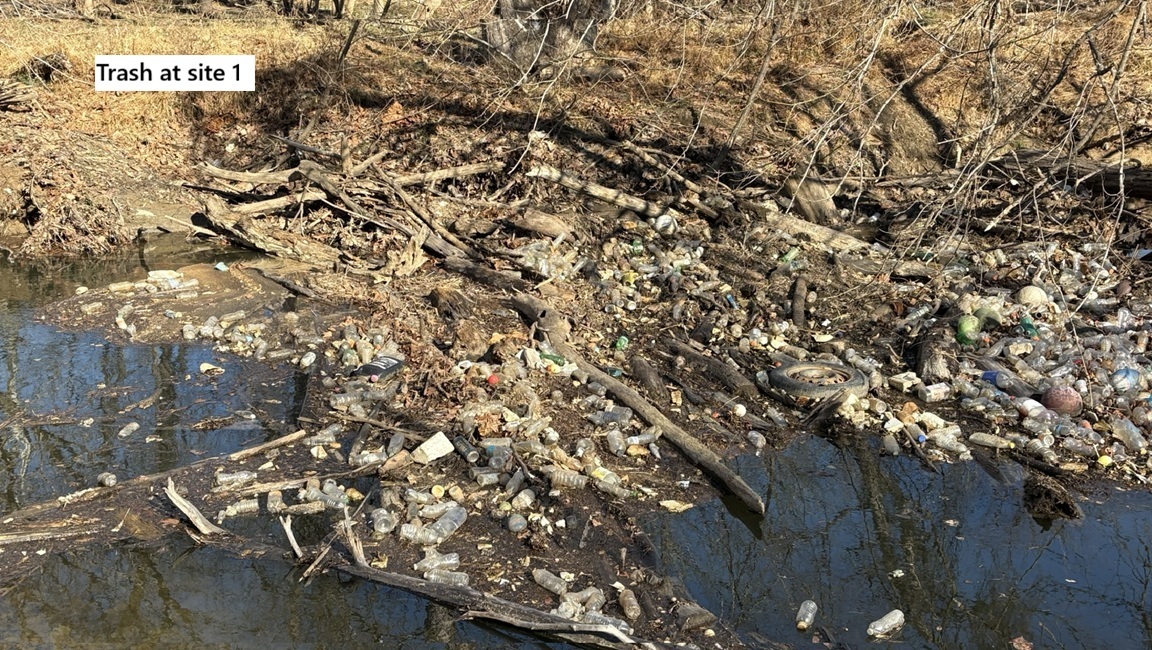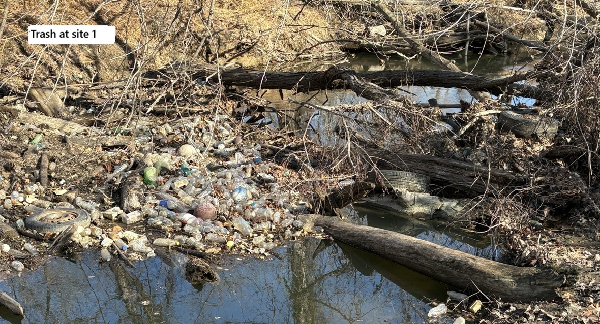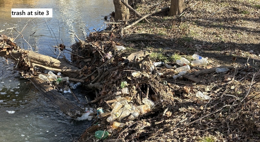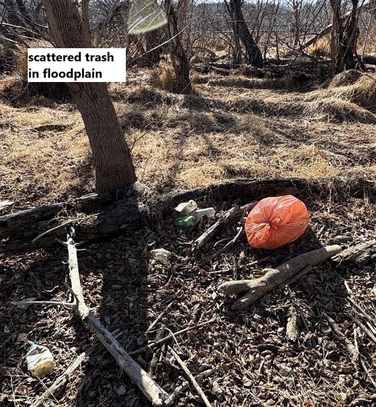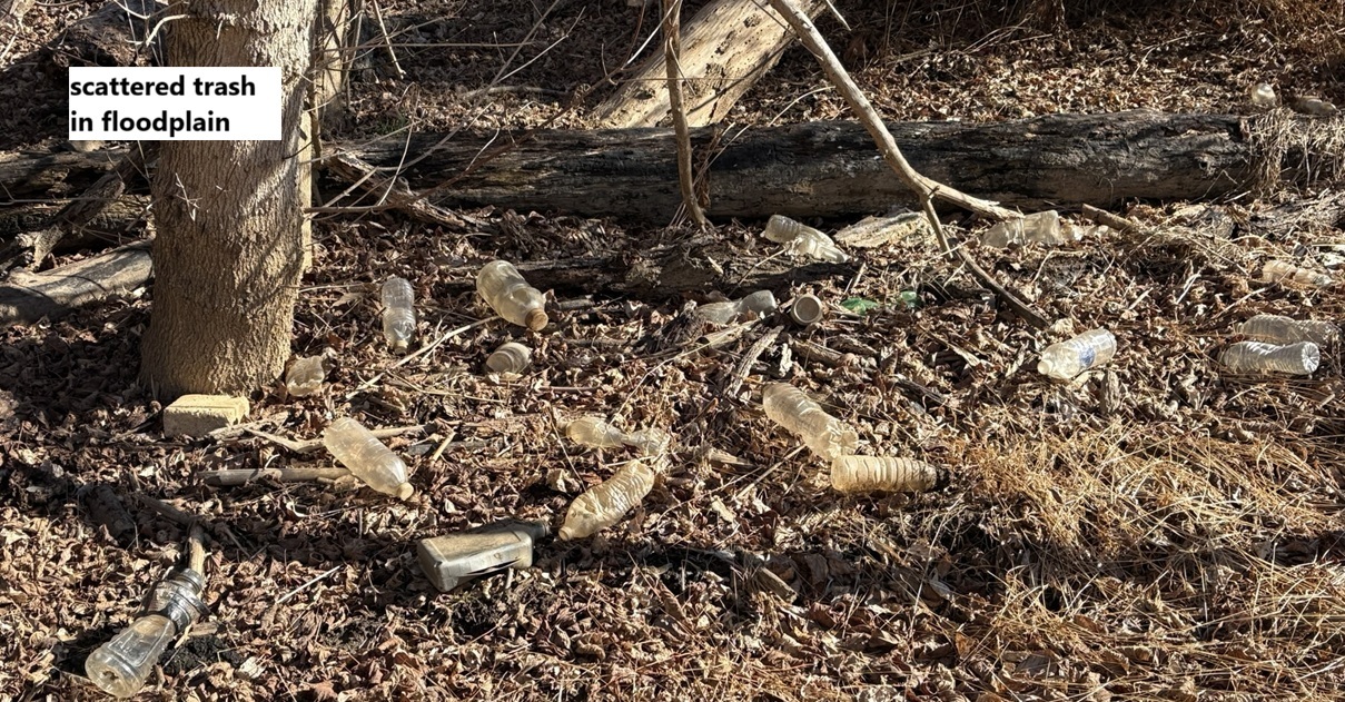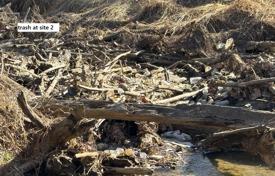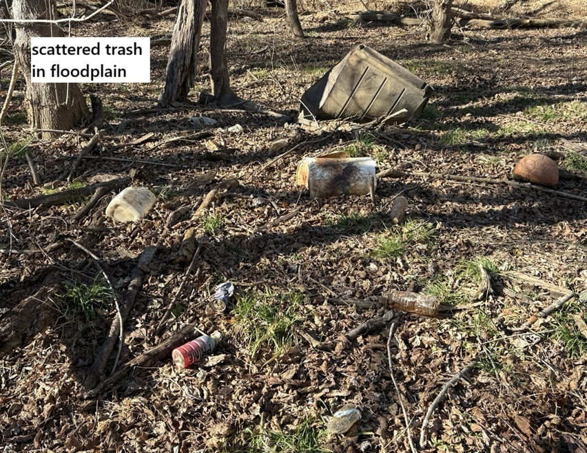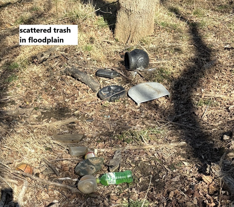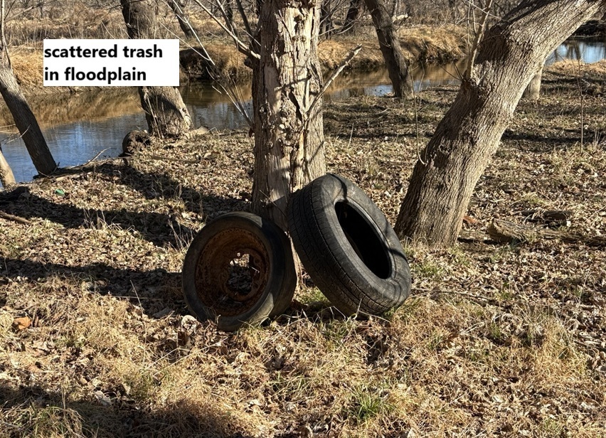 Here are some pictures of trash that has accumulated along the stream and in the floodplain; the locations are shown on the map above.