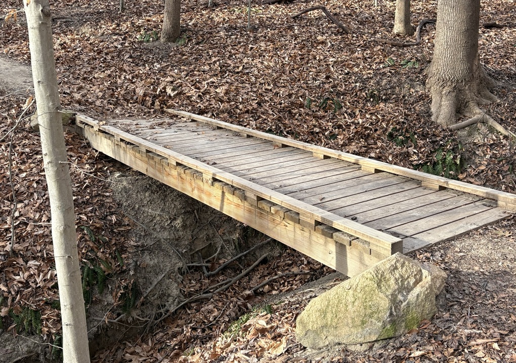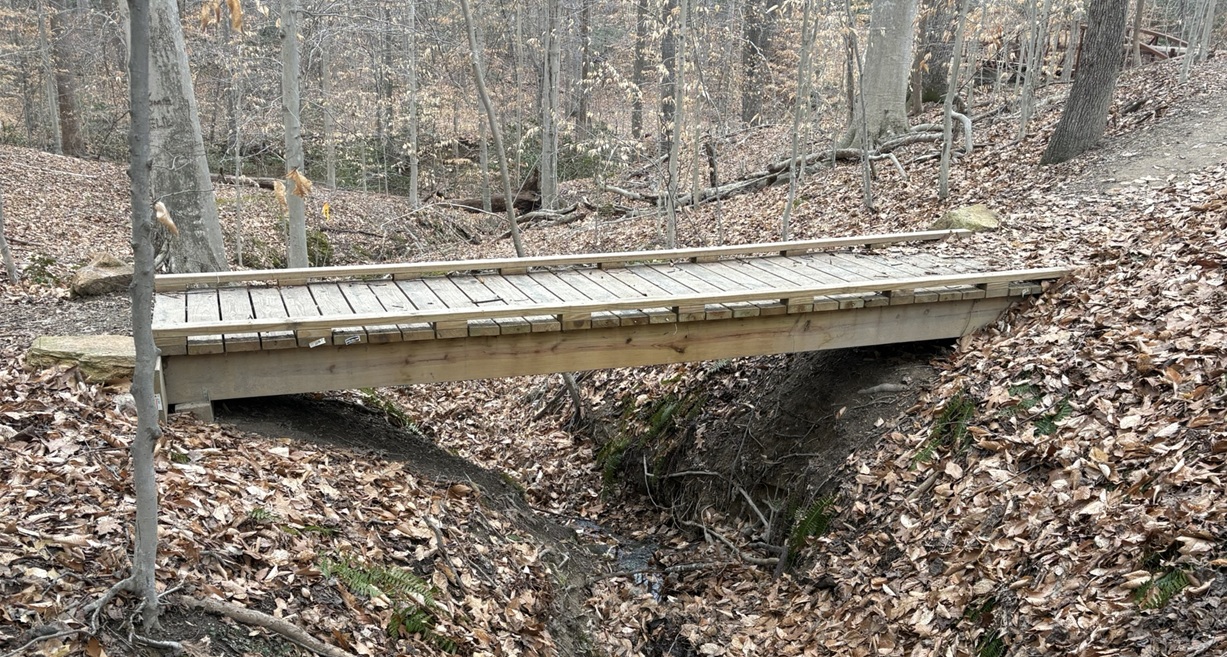The work will consist of opening the new trail route by raking, clipping branches, and removing downed branches. For the bridge, we’ll build the supporting frame, secure it in place, and install the treads.